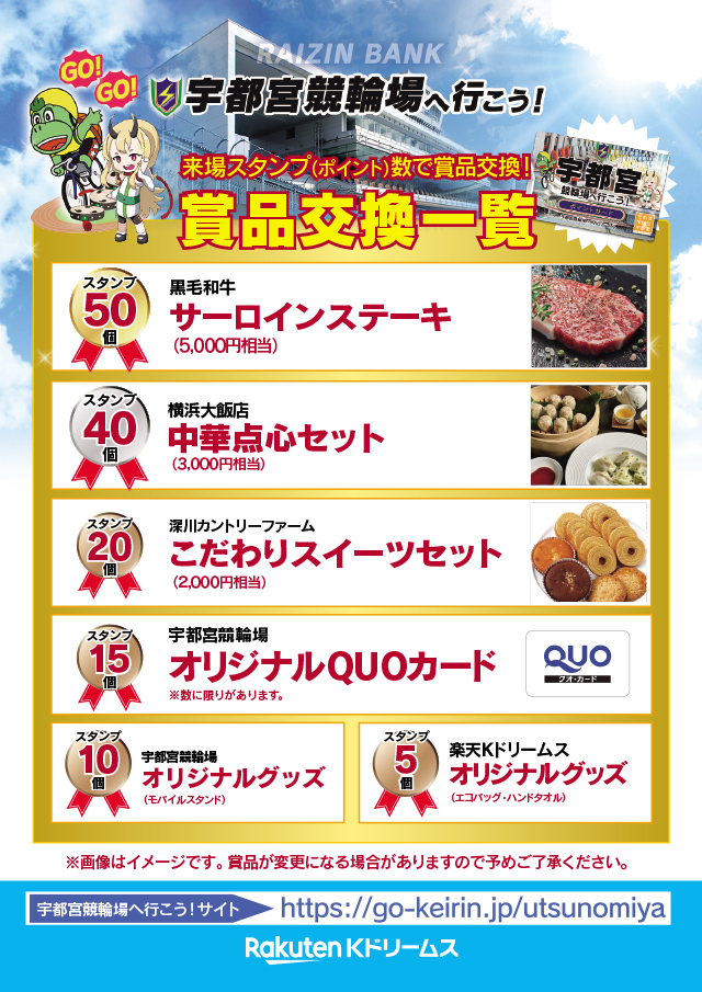 - ・宇都宮競輪場へいつもお越しいただきありがとうございます!来場スタンプ(ポイント)5個以上で賞品と交換できます♪