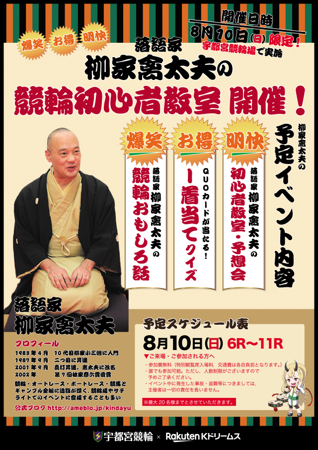 - (落語家)柳家禽太夫を司会に迎え、宇都宮競輪GⅠナイター(女子オールスター競輪)の最終日に予想会・解説会・1着当てクイズなどを実施します。さらに1着当てクイズに正解するとクオカードがもらえるチャンス!競輪初心者の方、ご家族連れの方などの是非この機会に宇都宮競輪場へお立ち寄りください。