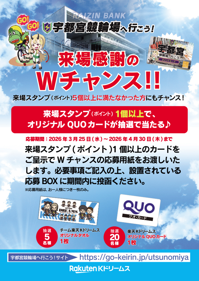 - ・宇都宮競輪場へいつもお越しいただきありがとうございます!来場スタンプ(ポイント)5個以上で賞品と交換できます♪